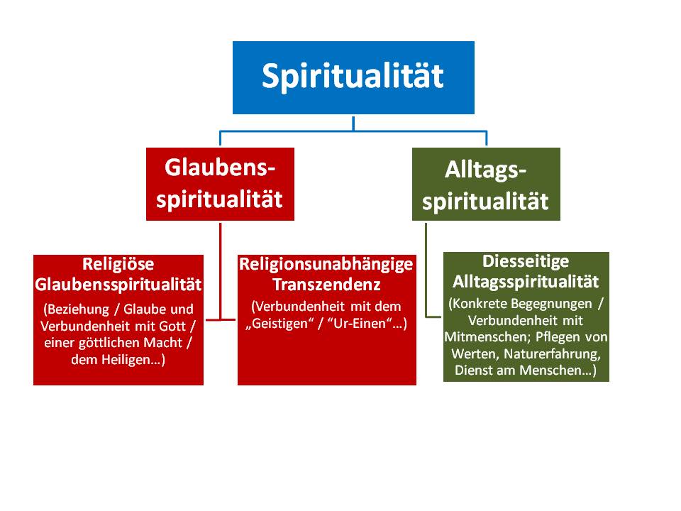 Die Studie hat gezeigt, dass sich das mehrdeutige Verständnis von Spiritualität stets in Spannungsfeldern bewegt: zum einen zwischen „Glaubensspiritualität“ (Glaube an Gott, religiöse Riten, Verbundenheit mit dem Heiligen …) und „Alltagsspiritualität“ (Naturerfahrung, Verbundenheit mit Mitmenschen, konkrete Begegnungen …); zum anderen zwischen einer explizit „religiösen Glaubensspiritualität“ und einer „religionsunabhängigen Transzendenz“ (siehe Abb.).