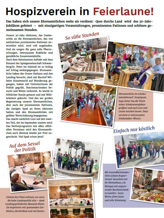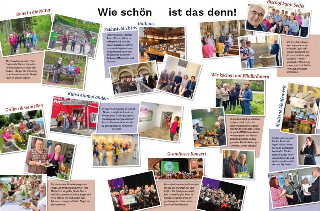 Nach dem fulminanten Auftakt mit dem Konzert der Spielgemeinschaft Schwanberg/St. Peter im Sulmtal ist es Schlag auf Schlag weitergegangen. Ehrenamtliche haben das Grazer Rathaus und den Landtag besucht, sind mit Bischof Wilhelm Krautwaschl auf Wanderung gegangen, haben mit VertreterInnen der Politik gegrillt, Buschenschenken besucht und Weine verkostet. Es wurde in fröhlicher Runde getanzt und mit Wildkräutern gekocht. Und das zur großen Begeisterung unserer Ehrenamtlichen, aber auch der prominenten PatInnen, die riesigen Spaß an ihren Aktionen hatten und den Ehrenamtlichen mit größter Wertschätzung begegneten.