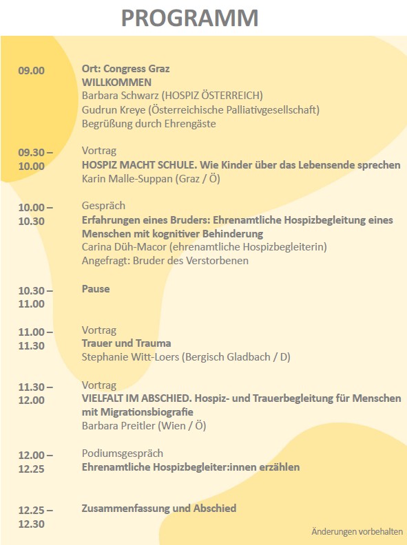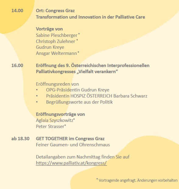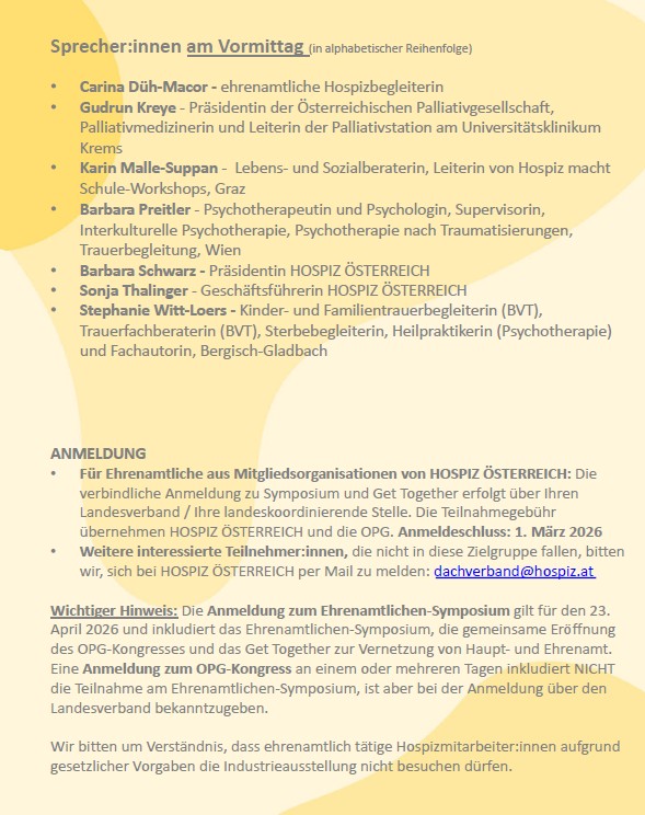 Die Österreichische Palliativgesellschaft, der Dachverband Hospiz Österreich sowie der Hospizverein Steiermark laden ehrenamtlich Engagierte in Hospiz und Palliative Care herzlich ein, an der Eröffnung des Kongresses und dem Programm am 23. April 2026 teilzunehmen.